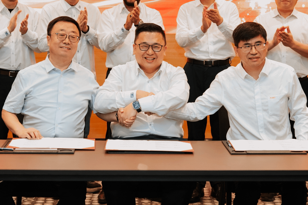 在各方見證下,東杰智能董事長韓永光、遨博智能董事長魏洪興與PTT集團董事總經理Teo Swee Phin共同簽署協議。